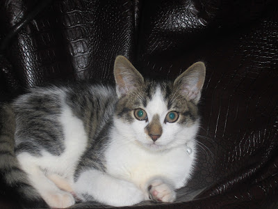 Here's the runt cat who loves to talk--Fang. This was my sister's cat, but when she moved out of her apartment, she stayed at my dad's and never left. This is Tank's buddy, so she came with us. She's about 9 years old.